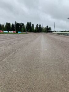 Kuva radasta ravipäivänä klo 10.30. Vettä satoi yöllä runsaammin ja nyt aamupäivällä hieman tihkuttaen. Rata tulee olemaan märkä ja kurainen, kuitenkin pitävä.